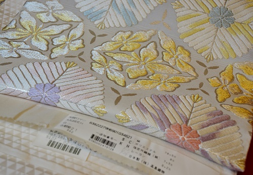 右の写真の帯は証紙番号25の野々村さんの帯です。さすがに25というと老舗の機屋さんです。同じような帯とは織りが全く違い、いい織をしておられます。こちらは、無地の紋付や付け下げなどに合わせていただきたい、小ぶりな礼装のための帯です。名古屋帯の感覚に近いですから、名古屋帯としてお使いいただけると思います。二点とも¥30,000、‐(別税)でお願いいたします。