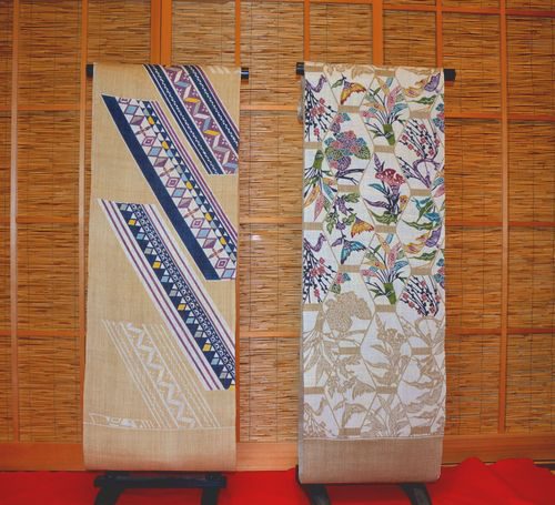 いま、最も寒いこの季節に、夏帯とは・・・とみなさま思われますでしょう。わたしたちは、昨年十一月ころから今年の一月くらいの間に、夏帯は発注いたします。染め屋さんや機屋さんは2月には夏物の生産を終わり、冬物にかかります。じっさいの需要期に入る5月ころには、生産者のところには品物はございません。早くに手当しておかなければ気に入った品物が安くでは手に入らないのです。この麻の染め帯は、苧麻ではなく大麻の生地です。繊維は太いのですが、涼感があり、汗ばむ季節に爽やかな締め心地で好評をいただいています。染めはご覧いただいただけでお判りいただけますように栗山さんです。単衣の時期にもお使いいただけます。単衣の紬やお召しなど、また、織の麻の着物や、夏お召し、夏大島や結城などに合わせてお使いください。¥56,000、-(別税)でお願いいたします。