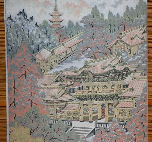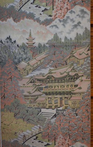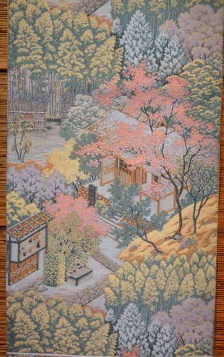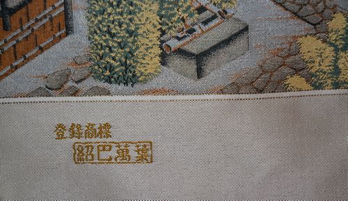 紹巴は西陣の帯の世界でもちょっと特殊な地位を占めた帯地です。練りこんだ上質の糸を抜きに使い、横糸で柄を織りだしています。もっと詳しく知りたいと思い何度か機屋さんに教えてもらうのですが、あまりに専門的でよく理解できていません。ただ、横糸で柄が織りだされていること、練り糸を使っていますので、締めては柔らかく締め心地はとてもいい・・・ことなどが特徴だと理解できます。紹巴の帯地の機屋さんは結構あるのですが、わたしの若いころから、萬葉さんは名門として教えられてきました。また、品物を拝見しても評価に恥じない魅力的な帯地です。写真の右が常寂光寺の柄で、左が日光の陽明門の柄です。萬葉さんにはもっと胴の懸かりの少ない機もありますし、名古屋帯も織っておられるのですが、わたしはこの重い機が好きで、いぜんから安く手に入れば逃さないで求めていました。最近はなかなか手に入りません。二点ともに¥165,000、-(別税)でお求めください。