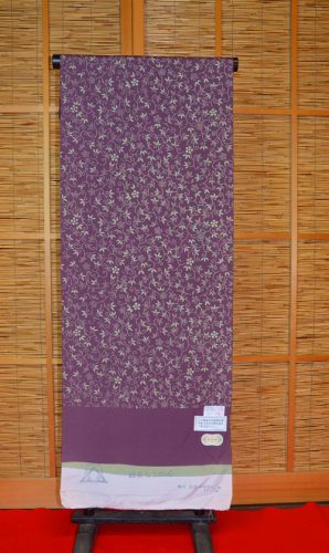 この小紋はやはり萬葉さんにお願いして、古い型紙を拝見して別染めをしてもらいました。大塚の生地に抹茶の薄色を引き染めして、糊を伏せ、引き染めしています。かってはどこにでもあった写し友禅です。また、プリントでも近い感じに染めることもできますので、このような手染めの染めは顧みられなくなりました。染め味がこれだけ違うのに・・・・との思いで、染めてもらいましたが、一点はお求めいただいたのですが、もう一点は在庫になりました。わたしの個人的な趣味ですので、致し方はないのですが、プリント小紋の値段なら求めてみようか・・・と思っていただけますとありがたいです。¥59,000、-(別税)でお願いいたします。