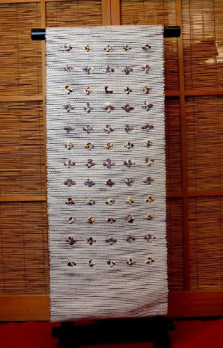 田村さんのぼかしは結構有名でして、なかなかこのぼかしの雰囲気を出せる職人がおられません。わたしも京都で同じように染めてもらいたいと頼んだことがありましたが、違った世界になってしまいました。お茶席でもよし、街着としても、観劇、食事会などと万能選手の趣があります。小紋としては格の高い染めですので、やや付け下げに近い感覚でお召しいただきますのが正解かなと思います。20年ほど以前には、この染めの柄を合わせて訪問着仕様のものを染めてもらい、刺繍などをあしらって、おしゃれな付け下げに作ったりいたしました。この生地は田村さんが丹後に特注で織ってもらった生地だとのことで、単衣もしくは8月を除いた5,6,7,9月、にお召しいただけます。8月はいまはもっと透ける生地(例えば紋紗など)が望まれますが、いぜんですとこの生地ですと夏物としてお召しいただいたと思います。わたしがこの反物を求めましたのも、生地を持って見て、これは・・・と思ったからです。田村さんはいつのころからかわれわれを相手にせず、展示会を全国規模で展開なされておられました。この小紋も40万を超えて発売なされておられたそうです。以前、同じような染め上がりで見積もってもらいましたが、職人の質が問題で、いい職人の手にかかると17万くらいでお求めいただかねばならなかった覚えがあります。この反物は¥98,000、-(別税)でお願いいたします。